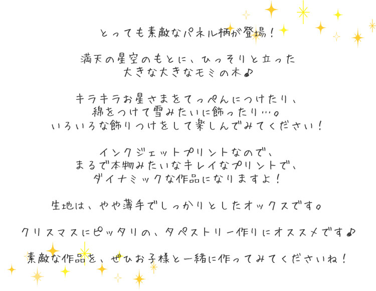 Chiristmasu Night Tree(クリスマスナイトツリー)≪オックスプリント≫【約72cmのパネル単位での販売】※112cm幅 コットン100%|タペストリー| ▲秋冬生地コレクションコーナーはこちら!▲ 商品価格:1,430円 レビュー件数:0件 レビュー平均:0(5点満点) 楽天で購入 トップページへ