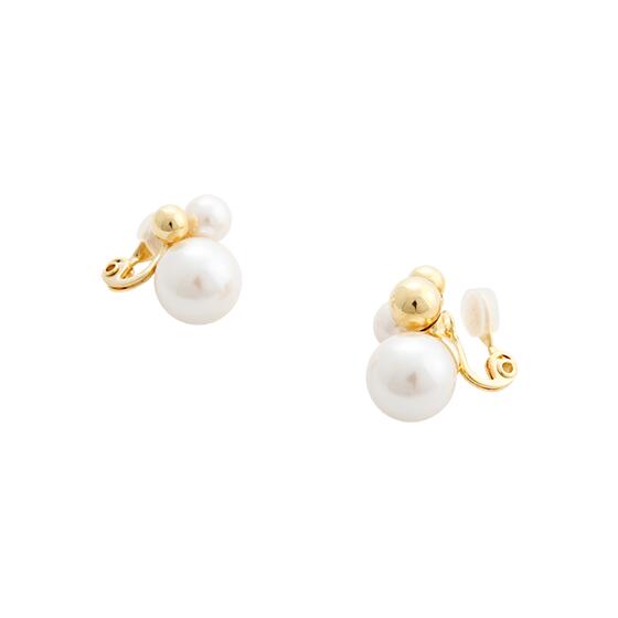パールとメタリックなメタルパーツの組み合わせがユニーク、立体的なデザインのアシンメトリーイヤリングです。